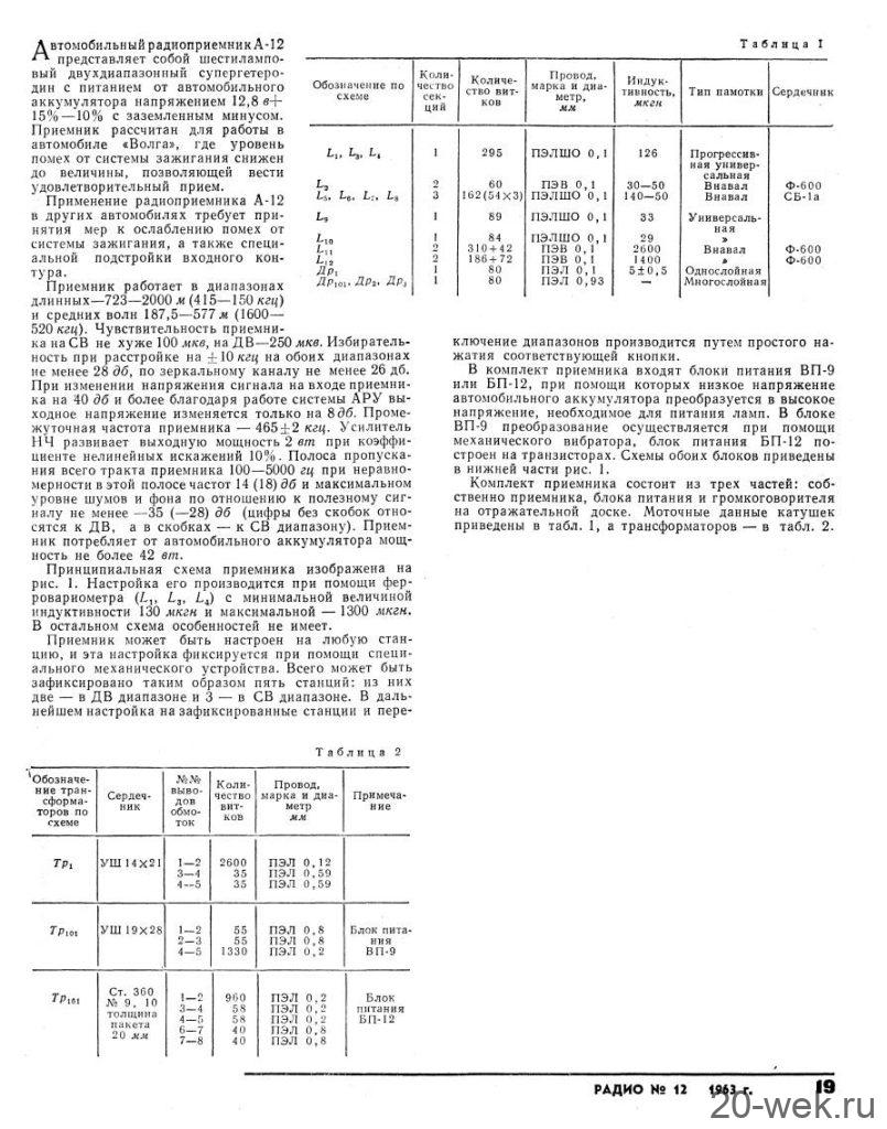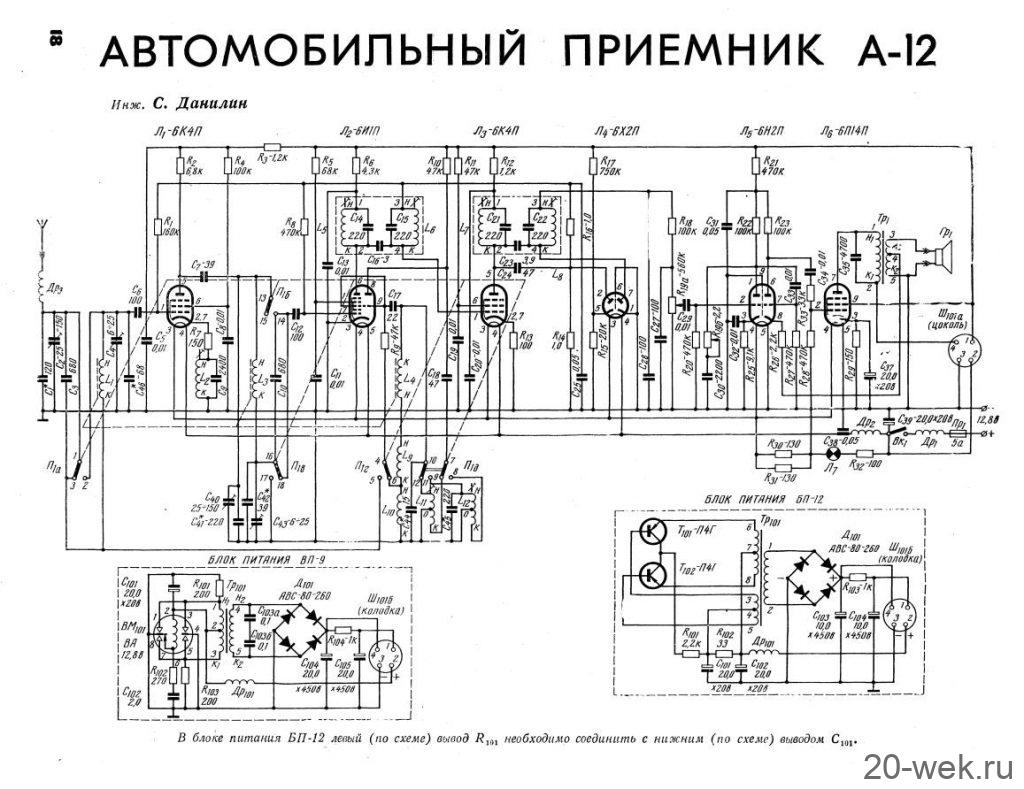 Радиоприёмник автомобильный *А-12* с 1959 года выпускал Муромский радиозавод. Он представляет собой шестиламповый двухдиапазонный супергетеродин, с питанием от аккумулятора напряжением 12,8 В с заземленным минусом. Рассчитан для автомобиля ГАЗ-21 где уровень помех системы зажигания снижен. Диапазоны ДВ и СВ. Чувствительность на СВ 100, ДВ 250 мкВ. Избирательность 28 дБ. При изменении напряжения сигнала на входе на 40 дБ, благодаря системе АРУ выходное напряжение изменяется на 8 дБ. ПЧ 465 кГц. Выходная мощность 2 Вт. Полоса пропускания всего тракта 100…5000 Гц. Потребляемая мощность 42 Вт. Приёмник можно настроить на любую радиостанцию и эта настройка фиксируется механическим устройством. Всего можно зафиксировать 5 станций: из них 2 в ДВ диапазоне и 3 в СВ. В дальнейшем настройка на зафиксированные станции и переключение диапазонов производится путем нажатия соответствующей кнопки. В комплект входят блоки питания ВП-9 или БП-12 при помощи которых напряжение аккумулятора преобразуется в высокое напряжение необходимое для питания радиоламп. В блоке ВП-9 преобразование осуществляется механическим вибратором, а блок питания БП-12 построен на транзисторах. Приёмник состоит из 3 частей: приёмника, блока питания и громкоговорителя укреплённого на отражательной доске. С 1961 года завод выпустил радиоприёмник типа **А-12А** имеющий аналогичные характеристики, электрическую схему и конструкцию, но отличающегося применением уже печатного монтажа.