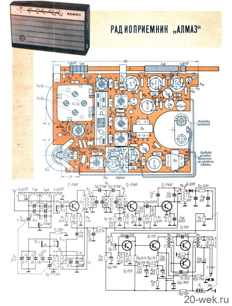 Портативный радиоприёмник 4-го класса *Алмаз* с 1964 года выпускали Ленинградские заводы *Новатор и *Радиоприбор*. Питание — аккумуляторная батарея 7Д-0,1 или Крона. Номинальная выходная мощность 50 мВт. Диапазоны СВ, ДВ, где чувствительность 1,5 мВ/м и 2,5 мВ/м. Избирательность по соседнему каналу 16 и 20 дБ, по зеркальному 20 дБ. Диапазон воспроизводимых частот звука 450…3000 Гц. Основные параметры сохраняются при снижении напряжения питания до 7,2 В. Габариты модели 134х83х34 мм. Масса 380 гр. Для переноски приёмник помещается в кожаный футляр. Приёмник выпускали в разных вариантах оформления до 1972 года. Завод *Радиоприбор* для использования заделов по окончании выпуска модели выпускал и ремонтные комплекты для мастерских и радиолюбителей состоящие из корпуса с громкоговорителем, платы (собранной и настроенной или плату и комплектующих) из которых можно было собрать аналогичный приёмник. Стоимость такого приёмника была на 30% дешевле заводского.