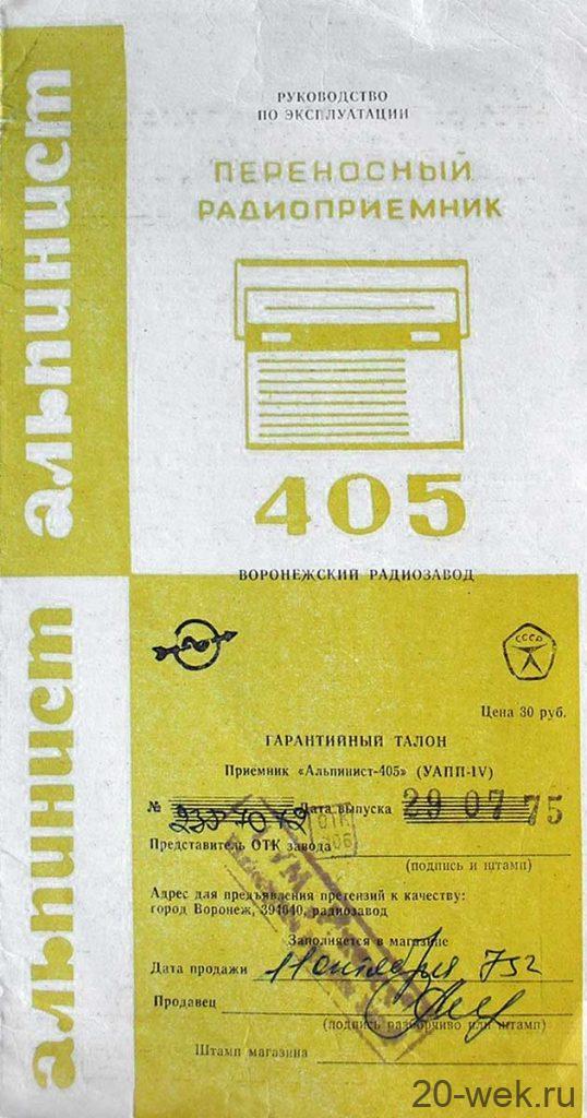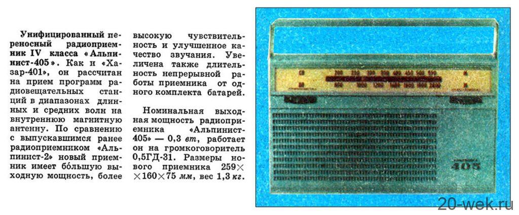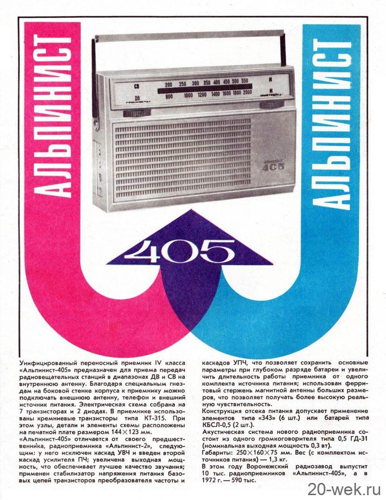 Радиоприемник «Альпинист-405» с 1971 года выпускал Воронежский радиозавод. Приемник стал первым унифицированным аппаратом, на базе которого были созданы модели «Альпинист-407» и «Гиала-404». Приемник «Альпинист-405» рассчитан на прием в диапазонах ДВ и СВ на магнитную антенну.