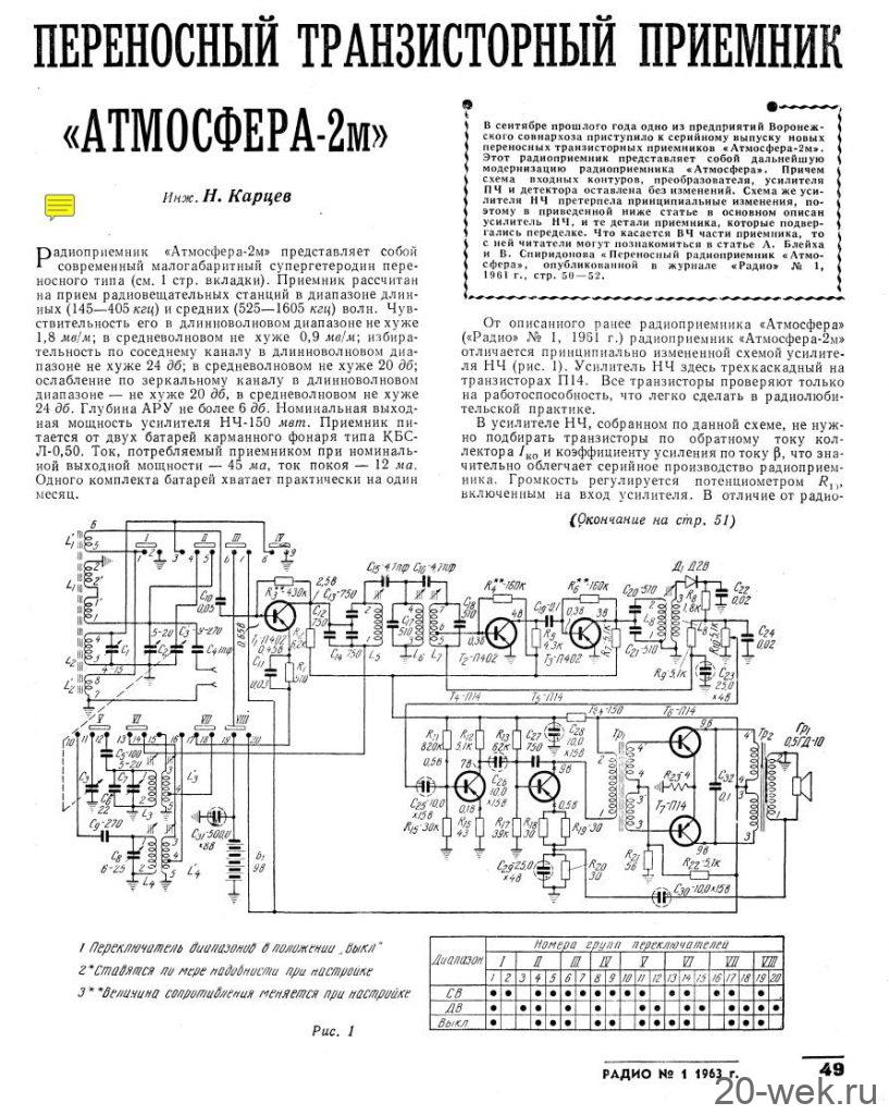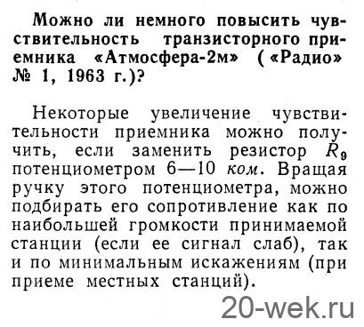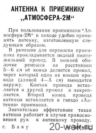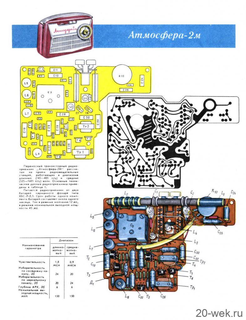 Портативный радиоприёмник *Атмосфера-2М* с 1962 года выпускали Воронежский и Грозненский радиозаводы. **Атмосфера-2М** — модернизация модели **Атмосфера-2**. Схема ВЧ части оставлена без изменений, а схема усилителя НЧ претерпела изменения. В нём применён выходной трансформатор для согласования с новым низкоомным громкоговорителем типа 0,5ГД-10, изменён согласующий трансформатор, заменены транзисторы в НЧ каскадах. Параметры приёмника остались прежними. Диапазоны ДВ и СВ. Чувствительность на СВ 1,5 мВ/м, ДВ 3,0 мВ/м. Избирательность по соседнему каналу 26 дБ. Номинальная выходная мощность 150 мВт. Громкоговоритель воспроизводит полосу звуковых частот 300…3000 Гц. Питается приёмник от 2-х батарей КБС-Л-0,5. Потребляемый ток при номинальной мощности 45 мА, в режиме покоя 12 мА. Корпус и габариты как и у приёмника **Атмосфера-2**. Вес 1,5 кг. Радиоприёмник Грозненского радиозавода имел отличия в расположении элементов и печатного монтажа усилителя НЧ (14-е фото).