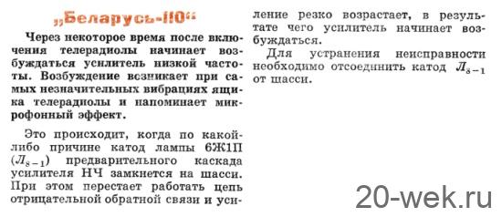 Телерадиола *Беларусь-110* с 1963 года выпускалась на Минском радиозаводе. Телерадиола **Беларусь-110** представляет собой комбинированную установку, имеющую телевизор на кинескопе 43ЛК9Б, всеволновый приёмник и универсальный проигрыватель. Телевизор обеспечивает высококачественный приём передач на любом из 12 каналов. Размер видимого изображения на экране телерадиолы 360х270 мм. В аппарате имеется системы АРЯ, подстройки частоты строк и стабилизации размеров изображения. Имеется пульт ДУ громкостью звука и яркостью изображения. Чувствительность 100 мкВ. Чёткость по вертикали 500, горизонтали 450 линий. Радиоприёмник имеет 4 диапазона: ДВ, СВ, KB (5,8…12,2 Мгц) и УКВ-ЧМ. Чувствительность приёмника на ДВ и СВ диапазонах 200, KВ 300, УКВ 50 мкВ. Номинальная выходная мощность 1,5 Вт. Полоса воспроизводимых частот 100…7000 Гц. Модель имеет 3 громкоговорителя, фронтальный 4ГД-1 и 2 боковых 1ГД-9, что обеспечивает высокое качество звучания. Гнёзда головных телефонов выведенные на заднюю стенку можно использовать для записи звука на магнитофон. Универсальный проигрыватель воспроизводит грамзапись с обычных и долгоиграющих пластинок на скорости: 78, 45, 33, 16 об/мин. Телерадиола питается от сети 127 или 220 в. Потребляемая мощность 200 Вт. Телерадиола выполнена в консольном и настольном вариантах. Для удобства при ремонте монтажная доска, на которой расположен четырёхскоростной проигрыватель II-ЭПУ-62, сделана подъёмной, что облегчает доступ к лампам и другим элементам. Шасси горизонтальное, укреплено в ящике на направляющих планках поэтому его можно вынимать и вставлять в ящик. Блок питания собран на отдельном шасси, которое соединяется с шасси при помощи разъема. Монтаж выполнен на пяти печатных платах из фольгированного гетинакса, каждая из которых является самостоятельным функциональным блоком. Кинескоп с выпуклым защитным стеклом и отклоняющей системой крепится к силуминовой маске, укрепленной на футляре который отделан ценными породами дерева. Габариты телерадиолы в настольном варианте 690х465х400 мм, консольном 690х955х400 мм, вес 38 кг. Цена 432 рубля 18 копеек.