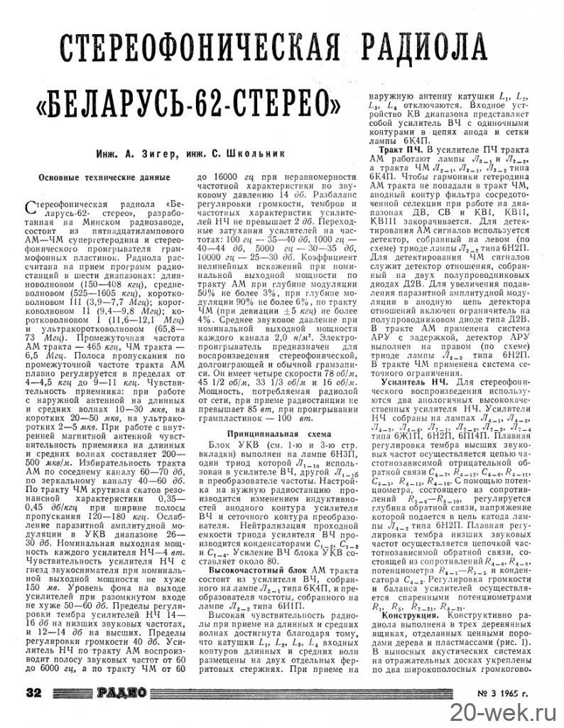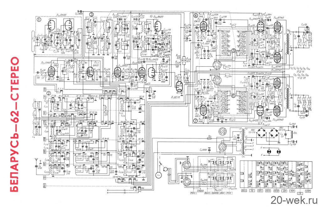 Радиола сетевая ламповая *Беларусь-62 стерео* с 1964 года выпускалась на Минском радиозаводе. Радиола первого класса **Беларусь-62 стерео** выполнена на базе радиолы *Беларусь-62* и имеет пятнадцатиламповый приёмник и универсальное 4-х скоростное ЭПУ. Диапазоны волн: ДВ, СВ стандартные, три поддиапазона КВ и УКВ. В радиоле имеется поворотная магнитная антенна, встроенный диполь для приёма в УКВ диапазоне, индикатор точной настройки на лампе 6Е1П. Чувствительность с внешней антенны в АМ диапазонах 50 мкВ, в ЧМ 10 мкВ. С магнитной антенны в ДВ, СВ диапазонах чувствительность 0,5 мВ/м. Избирательность по соседнем каналам в АМ диапазонах 60…70 дБ, в ЧМ — 40 дБ. ПЧ в АМ 465 кгц, в ЧМ 6,5 мгц. Максимальная выходная мощность усилителя — 2х8 Вт. Диапазон воспроизводимых звуковых частот при приёме на УКВ и проигрывании пластинок 80…16000 Гц и 80…6000 Гц при приёме в АМ диапазонах. АС радиолы состоит из трёх громкоговорителей, одного 3ГД-15 и двух 4ГД-28. Потребляемая мощность 85/100 Вт. Габариты радиолы — 650х315х350 мм. Её масса 22 кг.