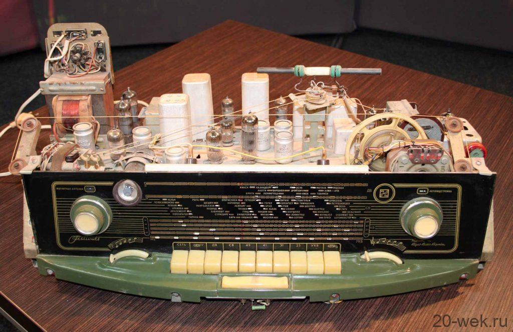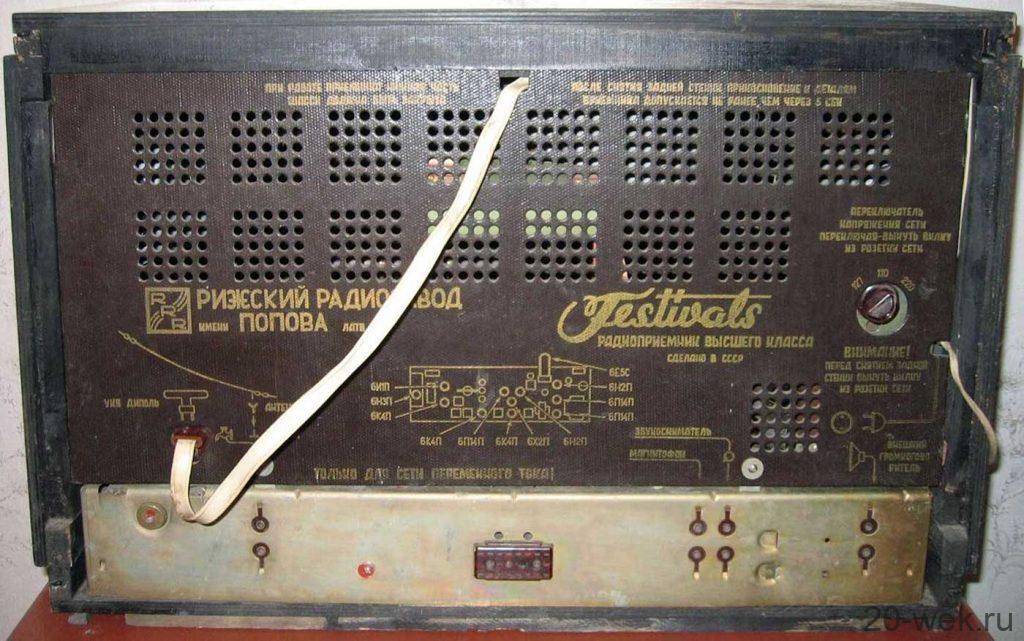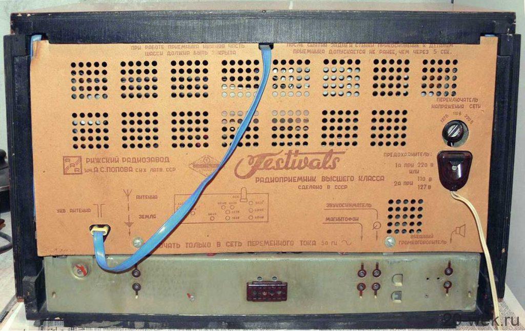 Радиоприёмник сетевой ламповый «Фестиваль» с осени 1957 года выпускал Рижский радиозавод имени Попова. В 1957 году документация серийного приёмника »Ленинград» передана на Рижский завод имени Попова, где он получил наименование »Фестиваль». К концу 1957 года была выпущена опытная партия, а с 1958 года начался массовый выпуск. Супергетеродинный приёмник высшего класса, с дистанционным управлением »Фестиваль» собран на 12 лампах, с внутренними антеннами, рядом новинок в схеме и конструкции, с механической АПЧ и ДУ с проводного пульта. Ручное управление обычное. Регулировка тембра НЧ, ВЧ объединена с полосой пропускания ПЧ AM тракта. В модели имеются гнёзда для наружных антенн, ЭПУ, магнитофона и дополнительных громкоговорителей. С пульта ПДУ на расстоянии до 6 метров можно осуществлять всё управление приёмником, кроме регулировки тембров. АС состоит из фронтального громкоговорителя 6ГД1, двух боковых широкополосных 4ГД2 и высокочастотного 1ГД1. В процессе производства в приёмнике применялись различные блоки ЧМ, а ВЧ громкоговоритель располагался на фронтальной панели справа или под НЧ громкоговорителем. Футляр имел оттенки, от тёмно-красного, до светло-жёлтого. Цена модели 276 руб. с 1961 года. На 1960 год планировался выпуск приёмника в лёгком футляре, чего не произошло. Диапазоны волн: ДВ, СВ и УКВ-стандартные. КВ1-49 м, КВ2-41 м, КВ3-31 м, КВ4-25 м. Чувствительность на всех диапазонах 50 мкВ, на УКВ 5 мкВ. Промежуточная частота АМ тракта — 465 КГц. ЧМ тракта 8,4 МГц. Избирательность на всех диапазонах 66 дБ, на УКВ 34 дБ. Полоса воспроизводимых звуковых частот АМ тракта 60…6500 Гц. ЧМ 60…12000 Гц. Выходная мощность: номинальная 4 Вт, максимальная 10 Вт. Потребляемая мощность 110 Вт. Габариты аппарата 660х424х311 мм. Вес 24,5 кг. Габариты ПДУ 222х220х58 мм. Его вес с кабелем 1,75 кг.