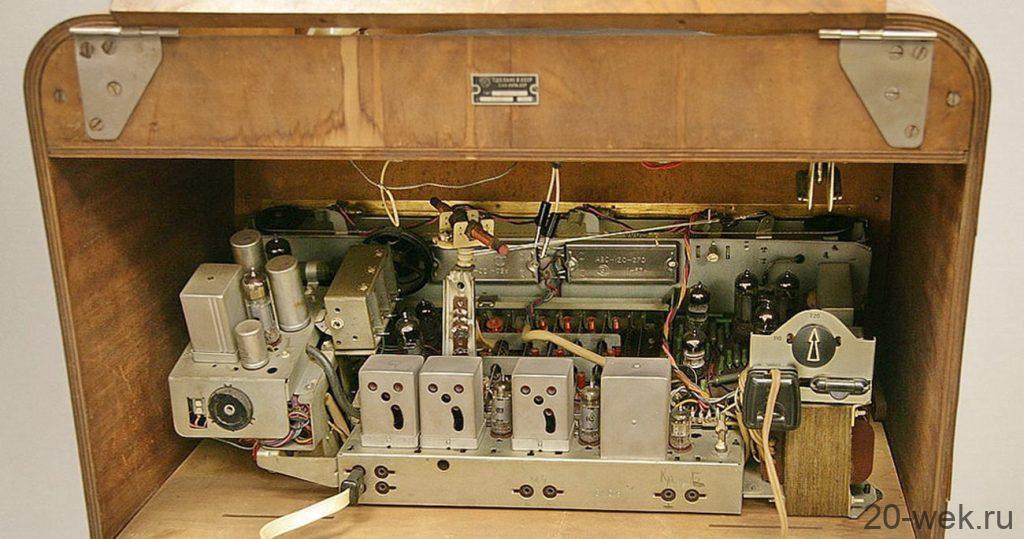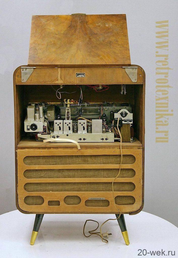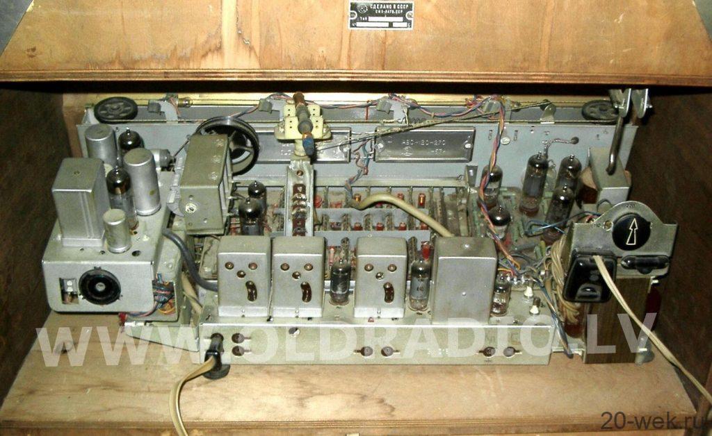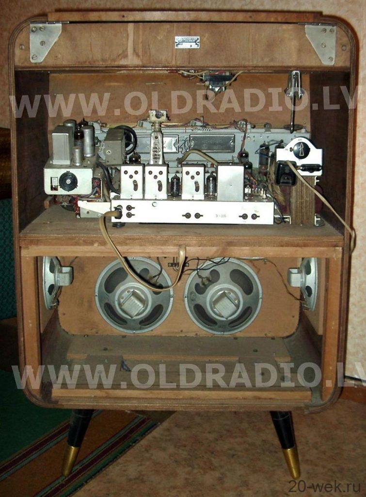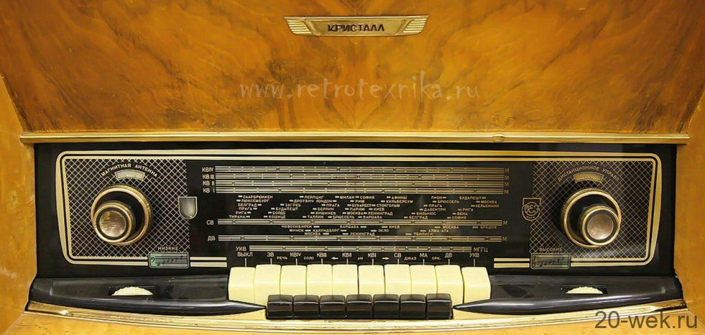 Радиола **Кристалл** с 1958 года опытно выпущена Рижским Государственным электротехническим заводом *ВЭФ*. Радиола выпущена в 3-х вариантах, с клавишным тонрегистром и механизмом автоматической настройки, проводным ПДУ как у радиоприёмника, с тонрегистрами расположенными на регуляторах громкости и настройки и без тонрегистров как у радиол **Латвия** и **Люкс**. Схема и конструкция радиолы практически совпадают с радиолой **Россия** и радиоприёмником **Люкс**. Ещё есть отличия в исполнении корпуса и акустической системы с объемным звучанием, которая у радиолы состоит из двух НЧ громкоговорителей типа 4ГД-1 установленных слева на фронтальной панели, одного 3ГД-7, который выполняет функции воспроизведения СЧ. Стоит он на правой стороне фронтальной панели и двух высокочастотных типа — ВГД-1, установленных на фронтальной панели в середине и двух таких же ВГД-1 или 1ГД-9, установленных на двух боковых стенках и воспроизводящих средние и высокие частоты. Диапазон воспроизводимых звуковых частот простирается от 30 Гц до 18 кГц с подъёмом на краях на 10 дБ. Радиола имеет 14 пальчиковых ламп типа: 6Н3П, 6И1П, 6К4П (3шт), 6Х2П, 6Н1П, 6Н2П (2 шт), 6П14П (4 шт) и 6Е1П. Был так же разработан и вариант стереофонической радиолы со второй АС и ППДУ (основное изображение). В 1959 году разработана радиола *Кристалл-2* с высокими акустическими параметрами которая осталась лишь выставочным экземпляром.