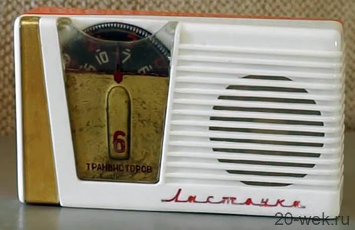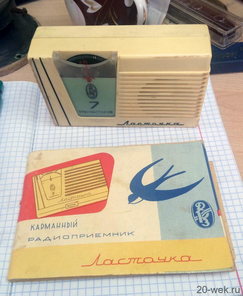 Карманный супергетеродин «Ласточка» собран на семи транзисторах и предназначен для работы в диапазонах средних (520—1600 кгц) и длинных (150—408 кгц) волн. Прием осуществляется на внутреннюю магнитную антенну. Чувствительность приемника в диапазоне ДВ не хуже 4,0 мв/м и СВ —2,5 мв/м, избирательность — не хуже 16 дб, номинальная выходная мощность — 90 мва. Номинальное напряжение источника питания 9 в. Приемник потребляет при отсутствии сигнала не более 8 ма и во время работы с номинальной выходной мощностью не более 30 ма. При снижении напряжения источника питания до 5,7 в работоспособность приемника сохраняется. Размеры приемника — 123Х72Х X34 мм, вес—.285 г. Изготовляется радиоприемник «Ласточка» на одном из заводов Приднепровского совнархоза. Цена второй модели 47 рублей 15 копеек.
