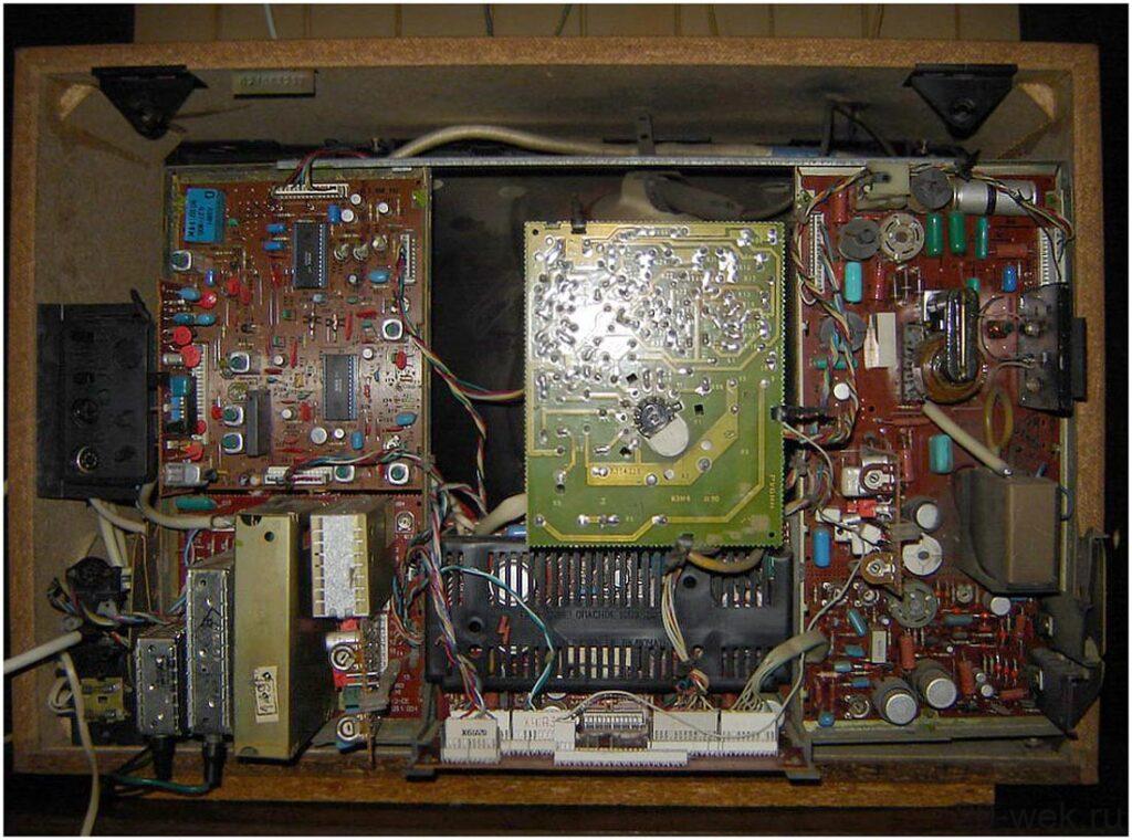 Телевизионный приёмник цветного изображения *Рубин 51/54ТЦ-402* с I-кв 1989 года выпускало Московское ПО *Рубин*. Цветной телевизор **Рубин 51/54ТЦ-402** — стационарный полупроводниково-интегральный модульной конструкции. Телевизор выпускался в 12-ти вариантах, с отечественными и импортными кинескопами размером 51 и 54 см. по диагонали с углом отклонения луча в 90 градусов и самосведением. Телевизор предназначен для приёма телевизионных передач цветного и ч/б изображения в МВ, ДМВ по системам СЕКАМ и ПАЛ. Модель обладает высокой чувствительностью и эффективной схемой АРУ, позволяя вести устойчивый приём. В телевизоре установлено устройство сопряжения с видеомагнитофоном, 8-ми программное устройство выбора программ с цифровой индикацией. В некоторых вариантах такой индикатор отсутствует. Любой телевизор обеспечивает автоматический выбор стандартов и системы цветного телевидения; автоматическое поддержание баланса белого цвета; подключение магнитофона для записи звукового сопровождения передачи; прослушивание его на головные телефоны; подключение видеомагнитофона для записи передач и воспроизведения видеозаписи. Модели выпускались в настольном оформлении. Чувствительность канала изображения, ограниченная синхронизацией в МВ диапазоне 40, в ДМВ 70 мкВ. Разрешающая способность в центре 350 линий. Номинальная выходная мощность канала звука 1 Вт. Диапазон воспроизводимых частот по звуковому давлению 100…10000 Гц. Потребляемая мощность 80 Вт. Габариты телевизора с экраном диагональю 51 см 453x643x482 мм, 54 см 453x643x473 мм. Вес телевизора 29 кг.
