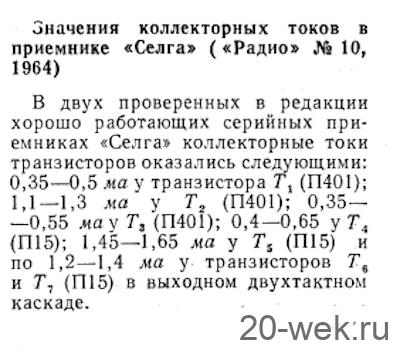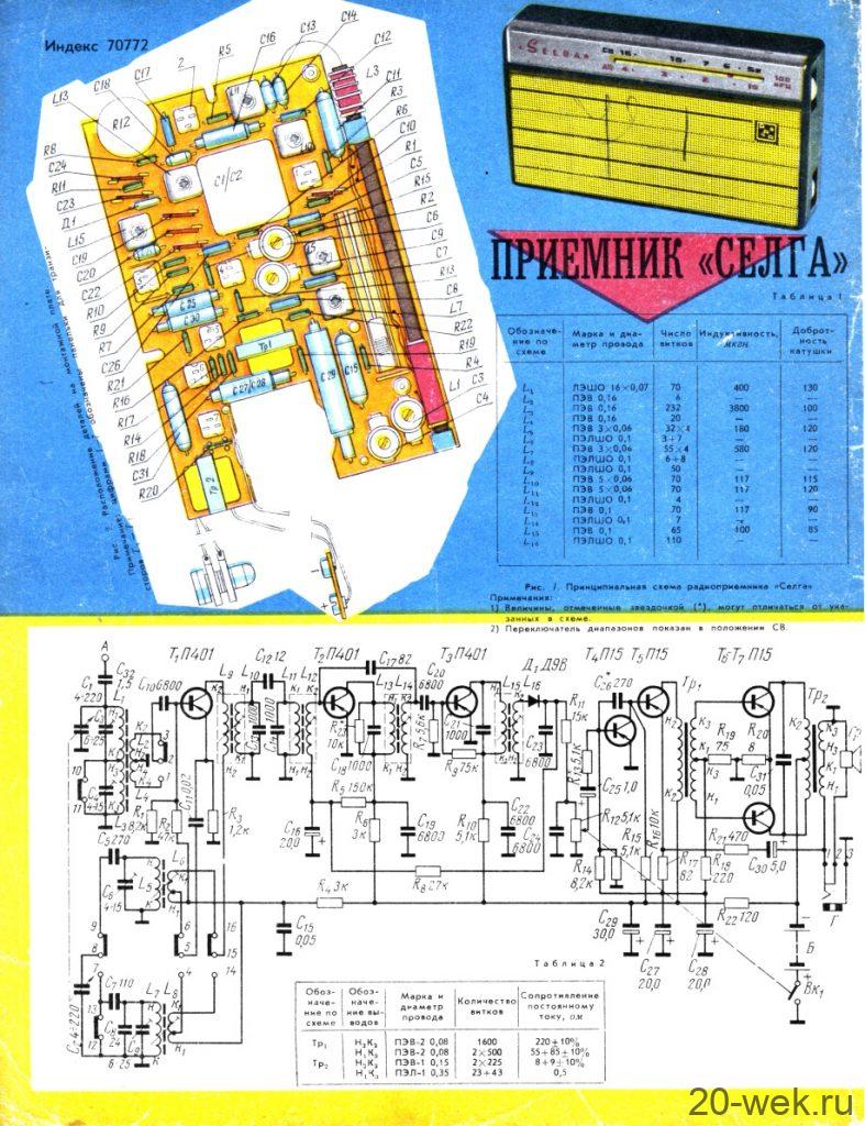 Портативный транзисторный радиоприёмник *Селга* с 1963 года выпускал Рижский радиозавод им. А.С.Попова. Первоначальное оформление приведено на первых фото, с 1964 года оформление было уже привычное. Приёмник экспортировался в ряд стран, поэтому надписи на шкале и на задней стенке были на русском или английском языках, известен вариант с наименованием *Convair*, смотрите три последних фото. В СССР в продаже были оба варианта. Ещё были различия в оформлении шкалы, где вместо надписи **7 transistor** был логотип завода **RRR**. Приёмники 2 варианта оформления выпускались в широкой цветовой гамме в различной комбинации цветов корпуса и задней крышки. Крышка имела белый или салатный цвет, а корпус мог быть чёрным, голубым, красным. В 1967 году радиоприёмник выпускался с табличкой *50 лет Великой Октябрьской революции*, в 1970 с табличкой *В.И.Ленину 100 лет*. Радиоприёмник **Селга** (Селга в переводе с латышского — открытое море) предназначен для радиоприёма в диапазонах ДВ и СВ. Приём осуществляется на внутреннюю магнитную антенну. Реальная чувствительность в диапазоне ДВ 2,0 мВ/м, СВ 1,2 мВ/м. Избирательность по соседнему каналу 30 дБ, зеркальному 26 дБ. Номинальная выходная мощность усилителя 100 мВт. Работает радиоприёмник от батареи Крона или аккумулятора 7Д-0,1, в этом случае к нему придается сетевое зарядное устройство. Продолжительность работы от батареи до 25 часов, аккумулятора до 12 часов. Реальная чувствительность приёмника сохраняется при снижении напряжения питания до 6,3 в, а работоспособность сохраняется до 5,6 в. На боковой стенке радиоприёмника имеются гнёзда для наушников и для внешней антенны. Габариты радиоприёмника 170х99х40 мм. Масса 480 гр. В комплекте радиоприёмника всегда был футляр с ремешком из кожи или заменителя кожи.