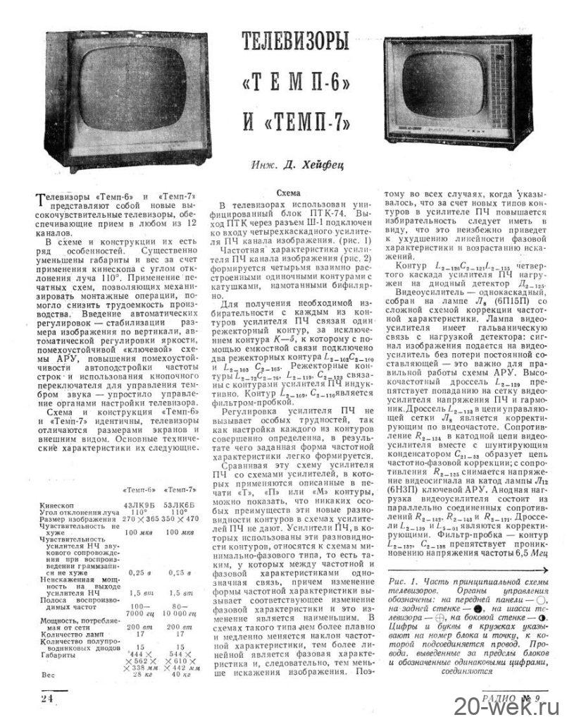 Телевизионные приёмники ч/б изображения *Темп-6* (С) и *Темп-7* (С) с 1960 года выпускал Московский радиозавод. Эти телевизоры воплотили в себе все последние достижения отечественной и зарубежной телевизионной техники начала шестидесятых. Они ни в чём не уступали лучшим зарубежным образцам, а по многим параметрам и превосходили их. Телевизоры созданы конструкторским бюро Московского радиозавода под руководством Д.С.Хейфеца. Модели представляют собой 17 ламповые 12 канальные телевизоры. Отличие в кинескопах и оформлении. В телевизоре **Темп-6** установлен кинескоп 43ЛК9Б с размером изображения 270х365 мм. В телевизоре **Темп-7** кинескоп 53ЛК6Б, с размером изображения 350х470 мм. Телевизоры имеют общую схему, конструкцию и характеристики. В телевизоре **Темп-7** за счёт большего футляра и улучшенной АС, где один громкоговоритель расположен в нижней части футляра, а другой сбоку, диапазон частот 80…8000 Гц, у телевизора **Темп-6** он 100…7000 Гц. В его АС также работают два громкоговорителя, но они находятся спереди. Номинальная выходная мощность 1 Вт. Чувствительность 100 мкВ. Такая чувствительность в сочетании с АПЧ и Ф и АРУ позволяет получить уверенный приём программ на наружную антенну в радиусе до 70 км. Потребляемая мощность 200 Вт. Имеется возможность подключения головных телефонов и звукоснимателя. Предусмотрен ППДУ для управления яркостью изображения и громкостью звука (в комплект не входит). Футляры деревянные, фанерованы ценными породами дерева. Габариты модели **Темп-6** — 444х562х338 мм. Вес 28 кг. Цена 336 рублей. Габариты телевизора **Темп-7** — 544х610х442 мм. Вес 43 кг. Цена 480 рублей. Телевизоры экспортировались в страны Европы (индекс Е) и Америки (индекс А). За годы производства (1960…1964) телевизоров **Темп-6** было изготовлено 320.000 экземпляров, **Темп-7** 13.500 экземпляров. С 1962 года Шауляйский телевизионный завод так же выпускал телевизор **Темп-6**. В конце 1964 года телевизор **Темп-7** модернизирован в модель **Темп-7Б**, но сведений об этом не нашлось.