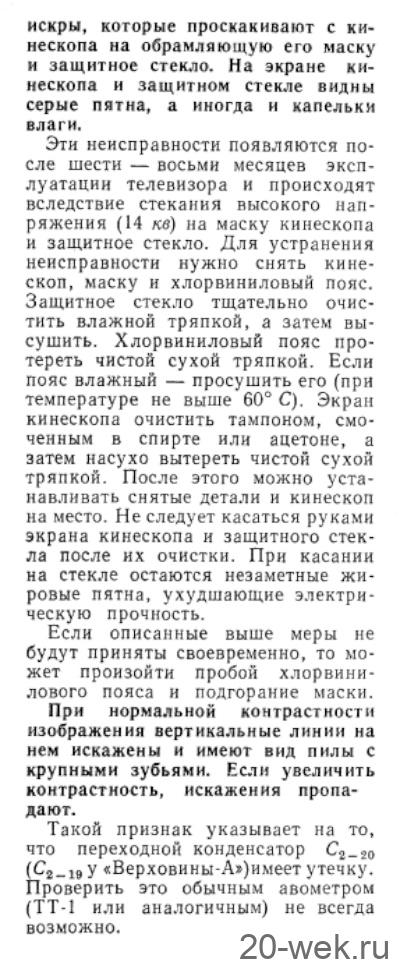 Такие признаки неисправности появляются тогда, когда конденсатор С4_2о—8200 пф в фильтре системы АПЧ и Ф имеет утечку. Для устранения неисправности следует заменить этот конденсатор.