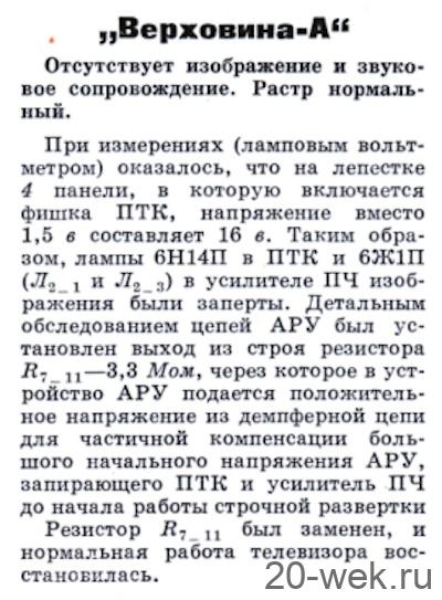 Такие признаки неисправности появляются тогда, когда конденсатор С4_2о—8200 пф в фильтре системы АПЧ и Ф имеет утечку. Для устранения неисправности следует заменить этот конденсатор.