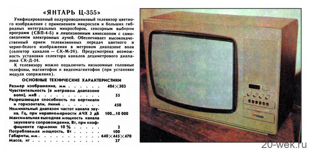 Телевизионный приёмник цветного изображения *Янтарь Ц-355/Д* с 1984 года выпускал Днепропетровский радиозавод. Унифицированный цветной телевизор **Янтарь Ц-355** собран на микросхемах, полупроводниковых приборах и больших интегральных микросборках, сенсорным селектором программ СВП-4-5 и лицензионным кинескопом с самосведением лучей. Модель обеспечивает качественный приём цветного и ч/б изображения в МВ диапазоне. Имеется возможность установки селектора каналов для приёма в ДМВ диапазоне, а модель с индексом *Д* работает в диапазоне МВ и ДМВ. К телевизору можно подключить головные телефоны, магнитофон и видеомагнитофон. Размер экрана 404 х 303 мм. Чувствительность телевизора — 55 мкВ. Чёткость в центре экрана — 450 линий. Диапазон воспроизводимых звуковых частот — 100…10000 Гц. Номинальная выходная мощность канала звука 2 Вт. Питание от сети 220 В. Потребляемая мощность 100 Вт. Габариты телевизора — 640 х 445 х 470 мм. Масса 27 кг.