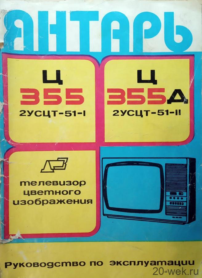 Телевизионный приёмник цветного изображения *Янтарь Ц-355/Д* с 1984 года выпускал Днепропетровский радиозавод. Унифицированный цветной телевизор **Янтарь Ц-355** собран на микросхемах, полупроводниковых приборах и больших интегральных микросборках, сенсорным селектором программ СВП-4-5 и лицензионным кинескопом с самосведением лучей. Модель обеспечивает качественный приём цветного и ч/б изображения в МВ диапазоне. Имеется возможность установки селектора каналов для приёма в ДМВ диапазоне, а модель с индексом *Д* работает в диапазоне МВ и ДМВ. К телевизору можно подключить головные телефоны, магнитофон и видеомагнитофон. Размер экрана 404 х 303 мм. Чувствительность телевизора — 55 мкВ. Чёткость в центре экрана — 450 линий. Диапазон воспроизводимых звуковых частот — 100…10000 Гц. Номинальная выходная мощность канала звука 2 Вт. Питание от сети 220 В. Потребляемая мощность 100 Вт. Габариты телевизора — 640 х 445 х 470 мм. Масса 27 кг.