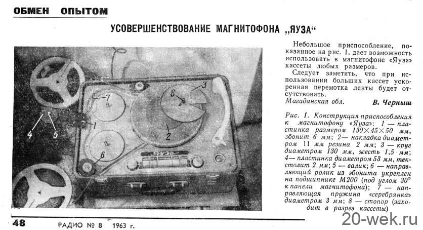 Магнитофон-граммофон *Яуза* (первенец завода) с 1956 года выпускал Московский ЭМЗ №1. Аппарат состоит из магнитофона и проигрывателя пластинок. Магнитофон рассчитан на запись и воспроизведение 2-х дорожечных фонограмм. ЛПМ имеет 2 скорости: 19,5 см/сек и нестандартную 8,13 см/сек, для записи речи. Время записи на 2-х дорожках на 1-й скорости 30 мин, на 2-й 1 час.10 мин. Катушки вмещают 180 метров магнитной ленты типа 1. Есть ускоренная перемотка ленты (2,5 мин.) в прямом и обратном направлениях. ЛПМ приводится в действие двигателем АД-2 и управляется клавишным переключателем. На выходе включены два громкоговорителя 1ГД-9. Полоса частот на 1-й скорости 70….7000 Гц, на 2-й 100…4000 Гц. Есть разъём для дополнительного громкоговорителя и вход адаптера. ЭП двухскоростной, с пьезокерамическим звукоснимателем с 2-мя долговечными корундовыми иглами для обычных и долгоиграющих пластинок. Питание от сети 110, 127 и 220 В. Потребляемая мощность ~ 80 Вт. Установка размещена в переносном футляре размерами 470х360х215 мм, оклеенном дермантином. В комплекте пьезоэлектрический микрофон. Масса модели 18 кг. На 1-м рисунке нулевой вариант аппарата, который в серию не пошёл. В серию пошёл 1-й вариант, он на всех фото. Был и 2-й вариант, отличавшийся громкоговорителями, изменениями в схеме, монтаже, ЛПМ и ЭПУ. Внешний вид был как у 1-го варианта.